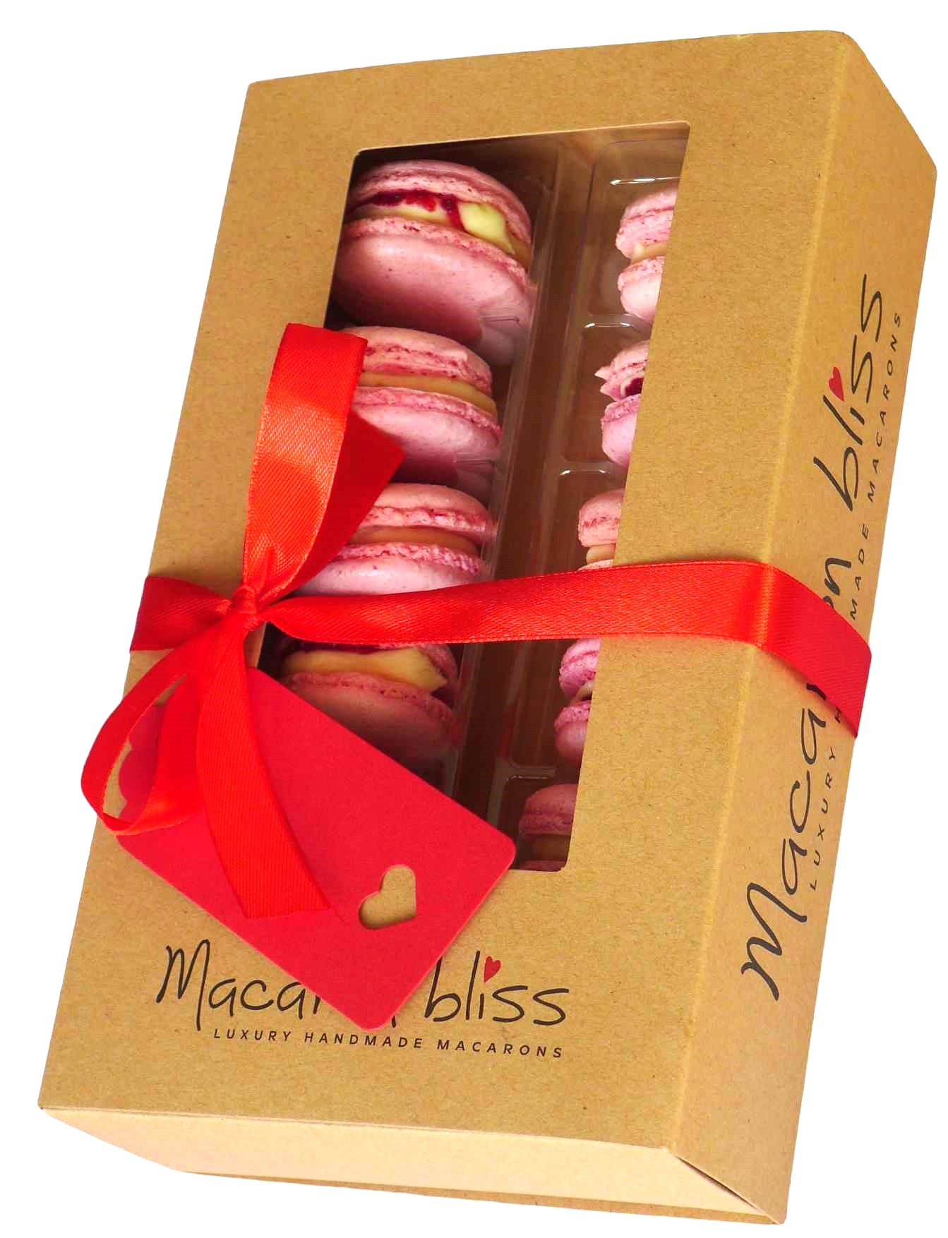 12 Pink Raspberry and White Chocolate Macarons – the perfect way to tell someone special you’re thinking of them this Valentine’s Day. Gift wrapped with red ribbon and gift tag. You also can add an (optional) personal message – please enter it at the checkout in the notes. You can also choose your own flavours by leaving a message in note box at the checkout.